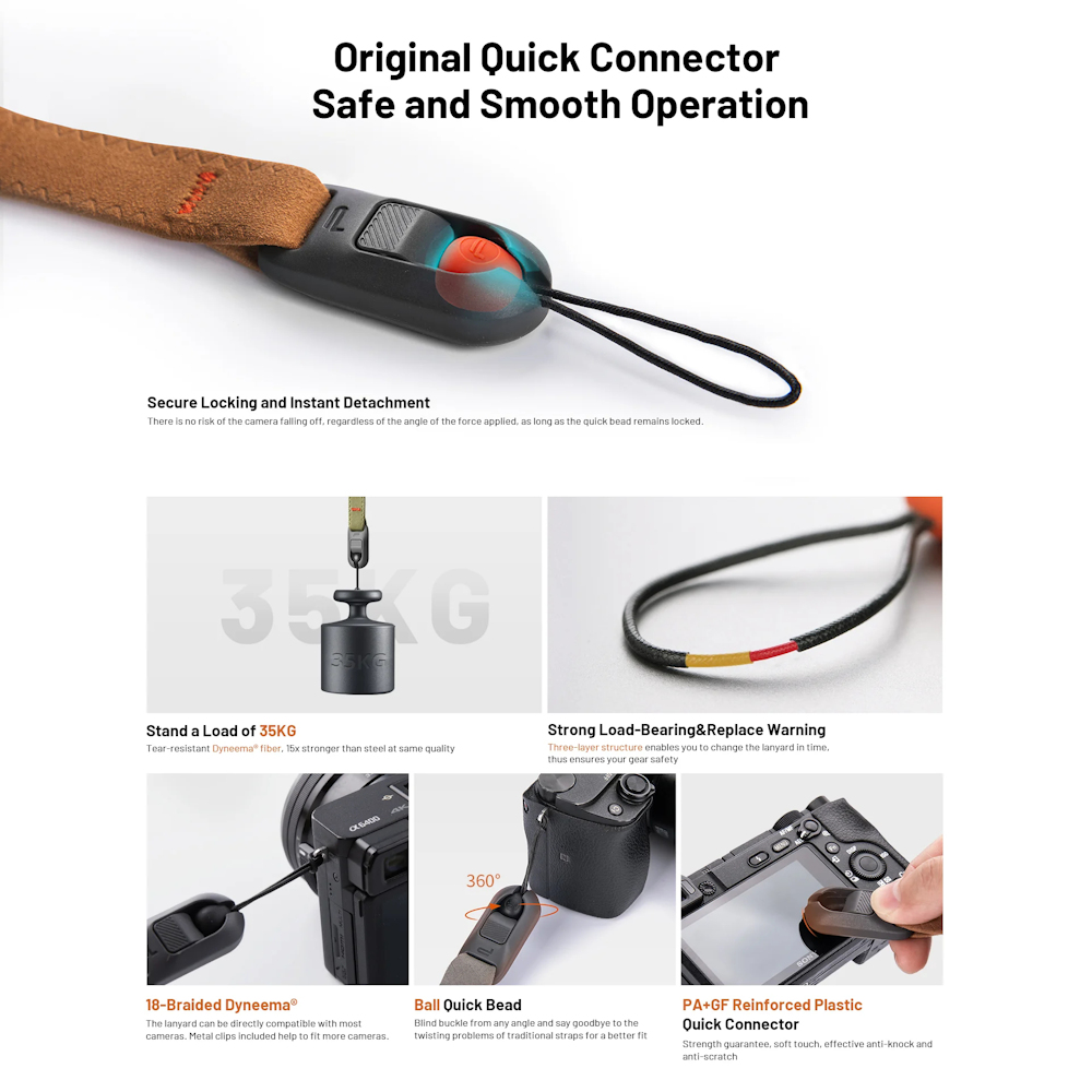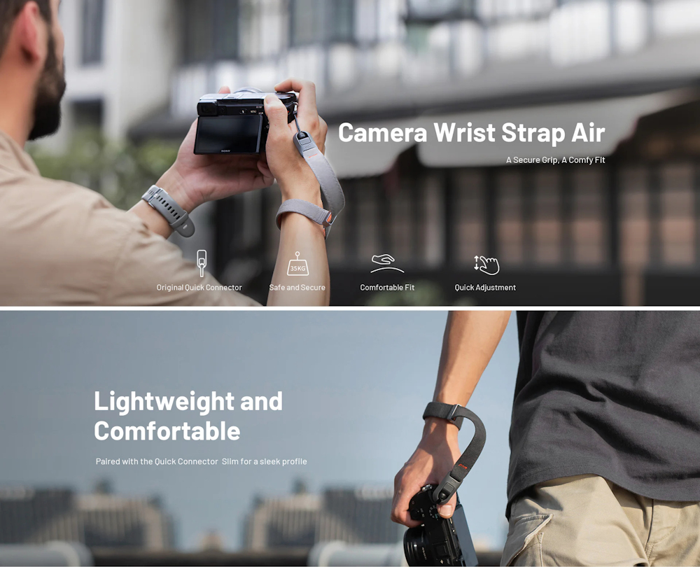 Built with a durable woven safety cord, the Wrist Strap Air offers excellent load-bearing capacity, giving you confidence even when carrying heavier mirrorless or compact DSLR setups. The Quick-Lock system makes it easy to attach or detach your camera in seconds, while the auto-tightening loop instinctively secures itself during accidental drops.