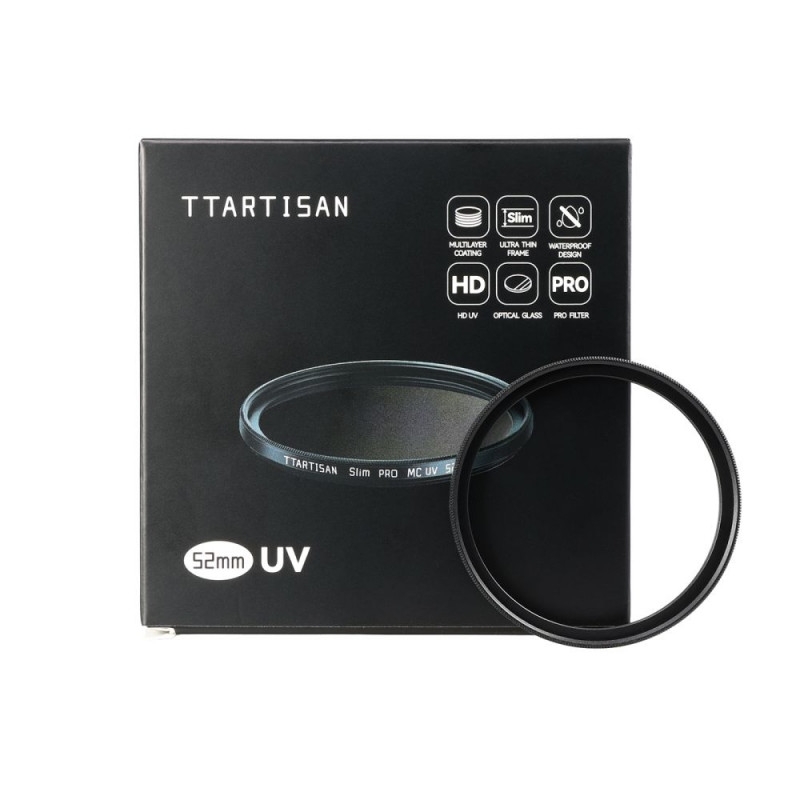 The TTArtisan Slim PRO UV Filter is a UV filter with a slim frame, allowing it to be used on wide angle lenses without vignetting. The multicoated, waterproof optical glass blocks UV light and protects the front lens element from scratches and bumps. Store and transport the filter using the included case.