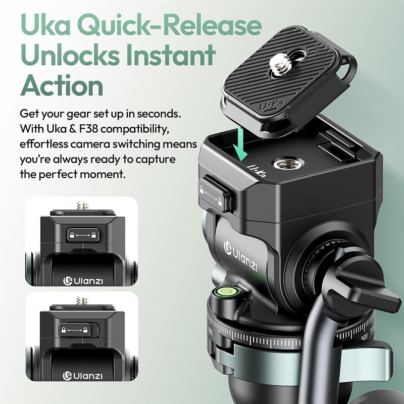 Incorporates the Uka quick release plate system with safety lock for quick mounting and secure camera attachment. Weighs only 1.76kg. Includes storage bag for easy transport and protection.